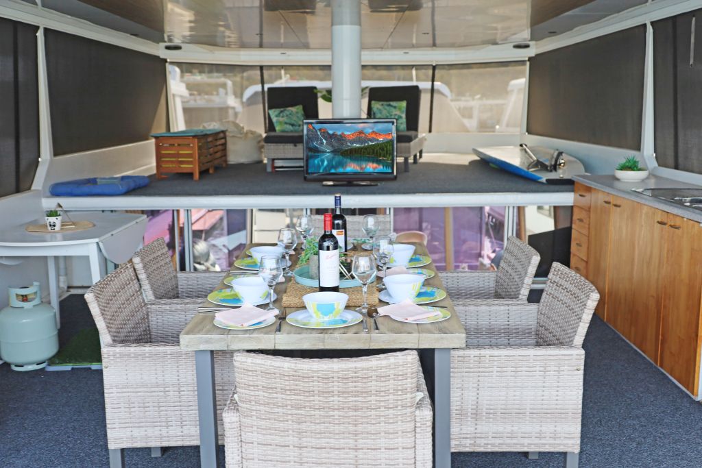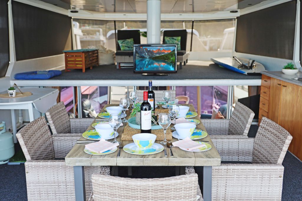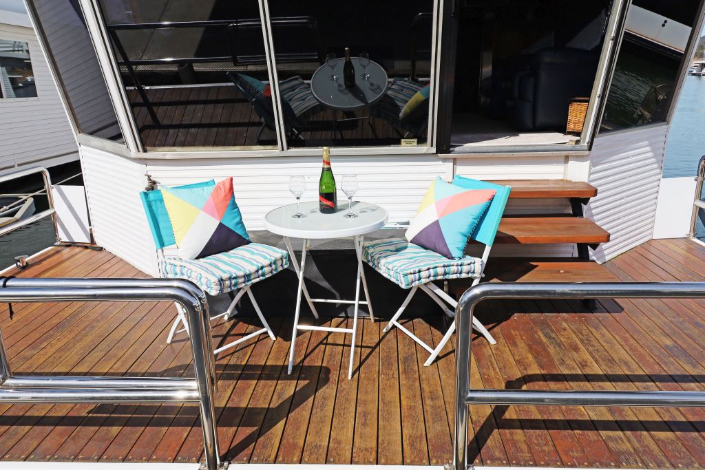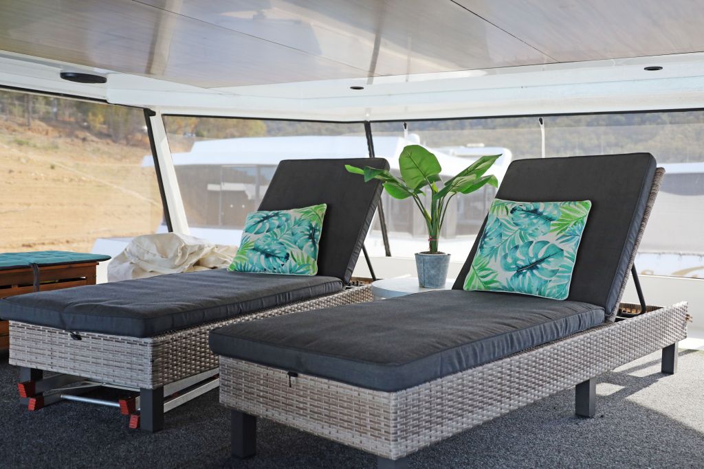 The rear deck provides another great space to just chill out and most importantly there is the hydraulic duckboard for all ages to enjoy a splash and swim in the Lake. The extendable sun awning will keep the heat of the late afternoon sun off the back of the houseboat.